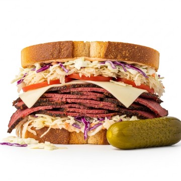 Pastrami, Sauerkraut, Cheese, gherkin, slaw